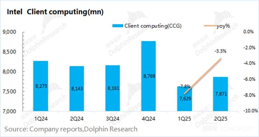 英特尔的客户端收入在 2025 年第二季度实现 78.7 亿美元,同比下滑 3.3%。虽然有部分客户提前备货,但公司的市场竞争仍是下滑的。
