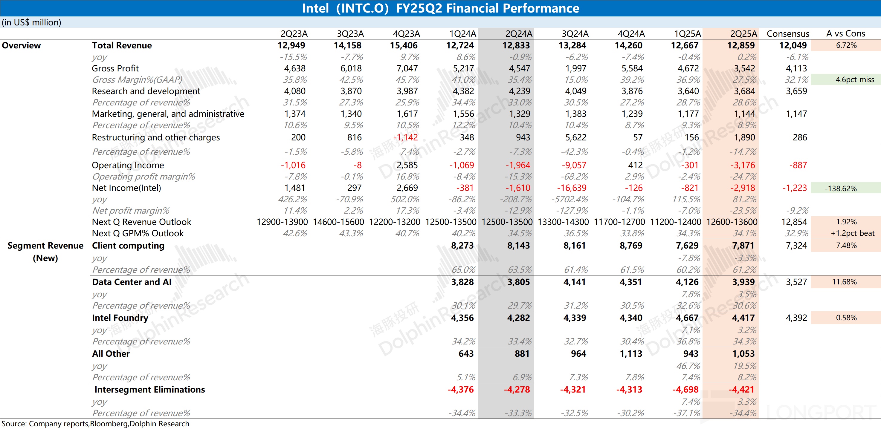 $英特尔(INTC.US) 于北京时间 2025 年 7 月 25 日上午的美股盘后发布了 2025 年第二季度财报(截止 2025 年 6 月),要点如下: