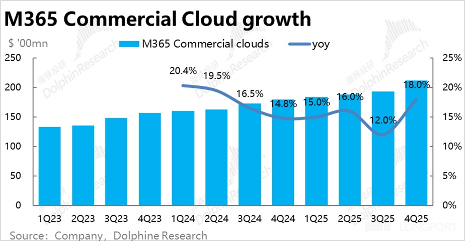 重要性排名第二的细分业务--微软 365 商业云服务(Microsoft 365 Commercial Cloud)恒定汇率下增长 16%,较上季小幅提速 1pct。