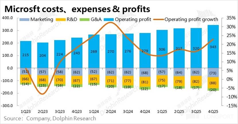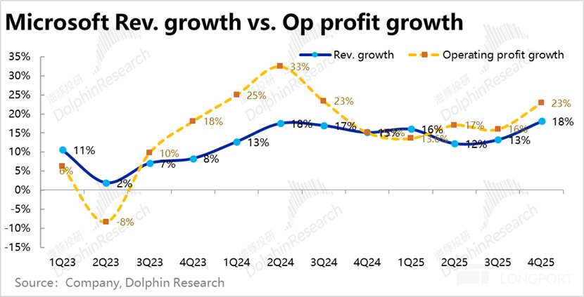 利润端,本季经营利润同比增长约 23%,较已不俗的收入增长更高,经营利润率同比扩张 1.8pct。微软正式确认进入增长提速、利润率扩张的双优业绩周期。