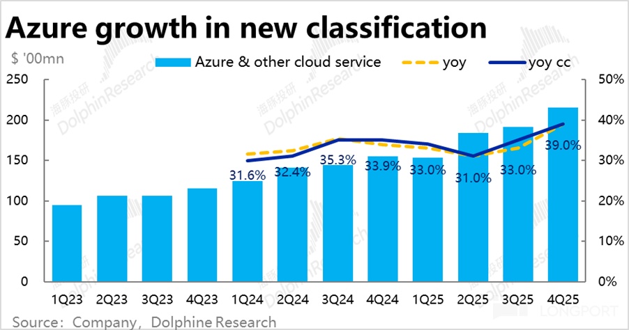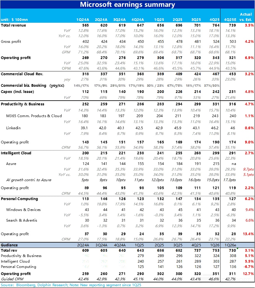 关键业务上,管理层预期 Azure 恒定汇率下的增速为 37%,虽指引环比减速 2pct。但业绩前,市场的预期也是从 F4Q25 的 36% 降速到 F1Q26 的 34%。即市场对季节性减速 2pct 早有预期,但实际指引的增速绝对值还是高于预期的。