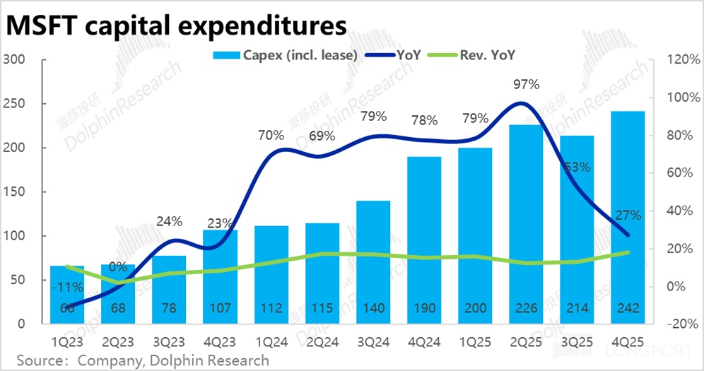 由于谷歌早先再度明显拉升了 Capex 指引,市场近期对后续 GPU 及其他硬件的投入预期也更趋于乐观。而微软本季包含租赁本季支出$242 亿,环比上季拉小幅升约 28 亿。