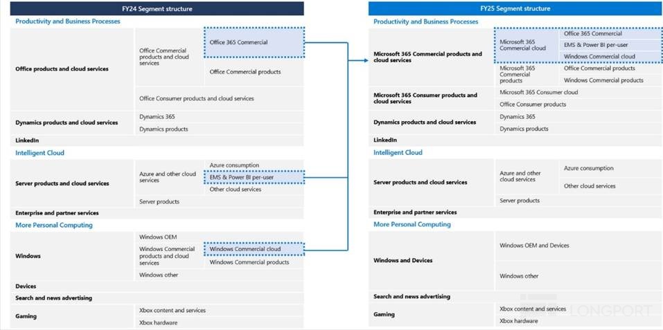 25 财年开始微软对财报披露的部门结构做出不小的调整。整体的调整思路是把面向企业的各类 365 服务,包括 Commercial Office 365, Windows 365 和 Security 365,全部从各自原板块调整到生产力&流程(PBP)大板块下。在 25 新财年首次调整时,海豚投研对此已较详细的解读,就不在每次财报中重复笔墨。下图简要概括了此次调整的变化。对口径调整更详细的看法请见1Q25 点评。