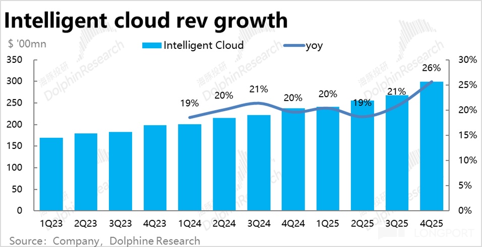 整体上,由于 Azure 业务超预期的增长,智慧云板块本季整体收入$299 亿,同比增长近 26%,环比明显提速近 25pct,也明显好于市场预期约 22% 的增长(也有汇率的利好因素)。