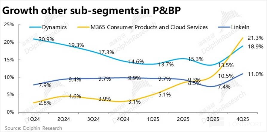整体上,由于汇率利好,以及商业 M365 和个人 M365 上平均价格提升的利好,本季生产力流程板块的整体的营收增速也提速到了近 16%,远超彭博一致预期 10% 出头的增长。