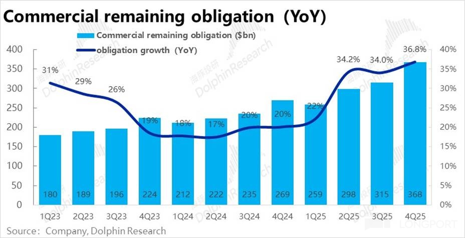 另一指标--待履约合同余额同样创新高地达到$3680 亿,同比大增近 37%。单季环比净增额达$530。无论是同比增速,抑或是单季净增额都创历史新高。