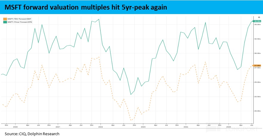 近期随着关税等宏观风险的退坡,以及市场对 AI 情绪再度走向极度乐观,微软的前瞻估值倍数也再度摸到区间高点的 35x 以上。从绝对角度看,当前市场对微软后续 2~3 年内约 10~15% 的收入增长预期,和 15%~20% 的盈利增长预期,对应 30x 左右的前瞻估值倍数中枢,显然包涵了相当的溢价。
