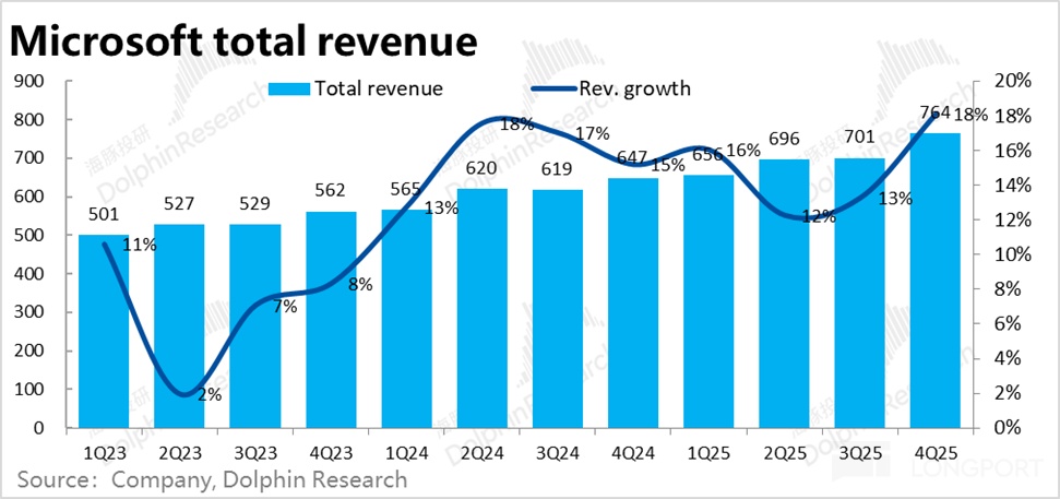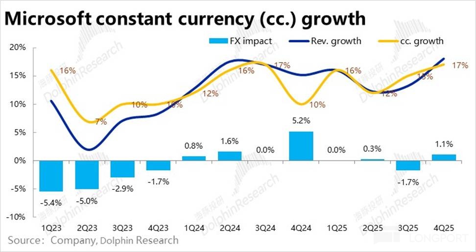 由于 Azure 极强的增长大超预期,其他板块虽没有特别亮眼,也同样强于市场预期,微软集团整体本季度营收$764 亿,同比增长 18%,环比明显提速。即便剔除汇率利好后,增速也环比提速了约 2pct。这远好于公司上季时指引的,在恒定汇率下收入增长可能小幅下滑的情况。