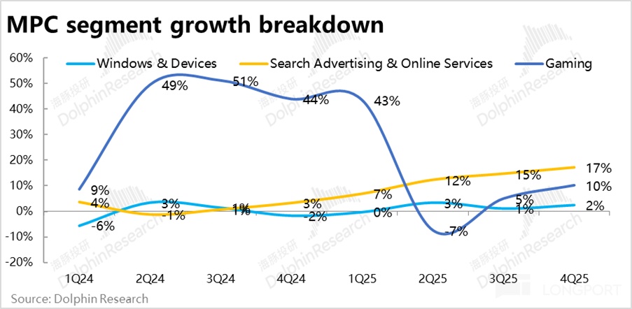 细分业务来看,Windows,广告搜索业务和游戏收入增速都有小幅的提速。其中搜索广告业务剔除买量成本后,收入同比增长了 21%,绝对增速不低。据公司解释,搜索量和单次搜索创造的收入都有增长。
