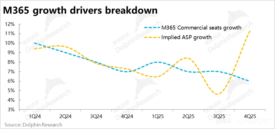 驱动因素上,订阅坐席数量同比增加了 6%,预期内的继续小幅放缓。但因更多用户采用高定价的 E5 和 Copilot 功能,平均客单价提升了约 11%(也有汇率因素利好)。