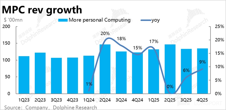 在完全渡过了并表动视暴雪的影响期后,更多个人计算板块的增长回归常态。本季度营收增长 9%,相比上季的 6% 有一定改善。