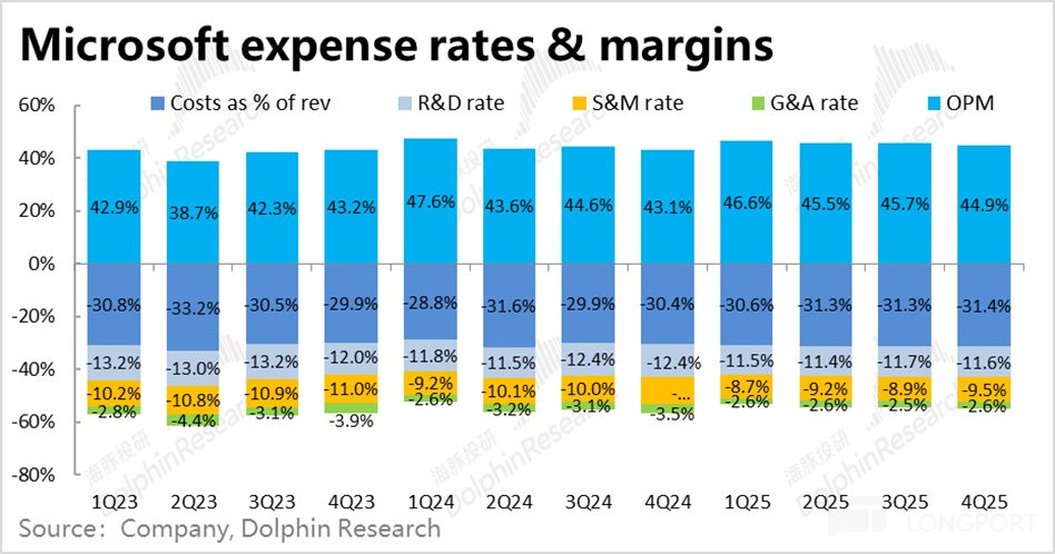 5、科技提效:本季成本和费用的实际支出,大体持平乃至小超公司上季时给出的指引。换言之,超预期的利润主要是来自强劲的预期外增收,而非公司在控费上超预期的节省。具体看,由于在 AI 等业务上的天量 Capex 投入,微软的毛利率确实在承压(本季同比收窄了 1pct)。