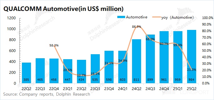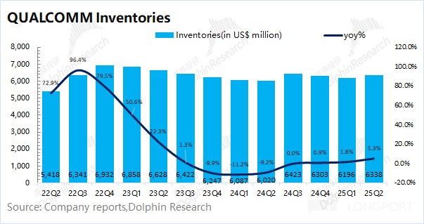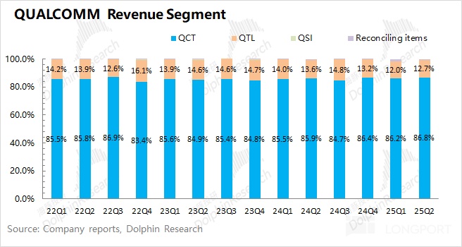 4、下季度指引:高通预期 2025 财年第四季度营收 103-111 亿美元,区间中值环比增长 3.2%,市场预期 105.8 亿美元;公司预期下季度的 Non-GAAP 每股利润为 2.75-2.95 美元,市场预期 2.83 美元。随着下季度进入将进入年末旺季备货期,公司业绩将有所好转。