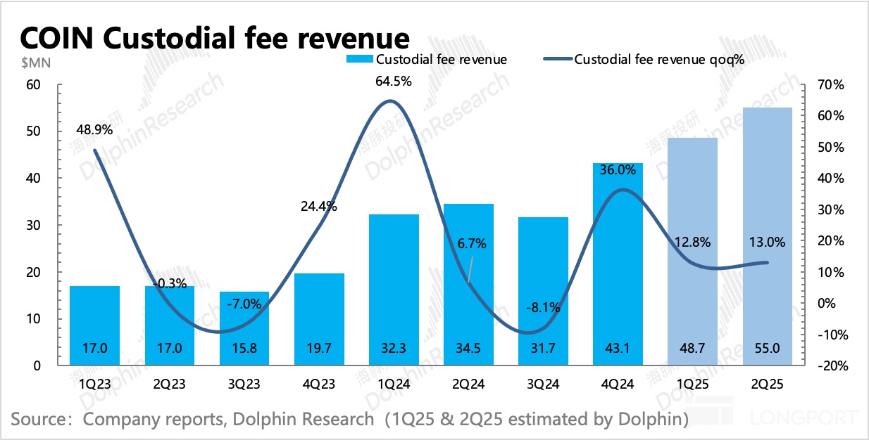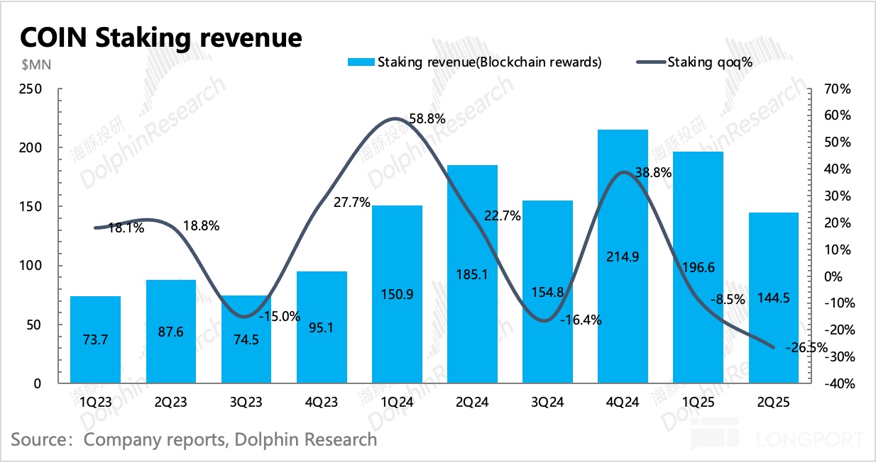 而订阅收入中,除了机构托管费(预计本季度随托管规模环比增长 13%),比特币并不直接创造增量,反而质押业务的核心资产品种 ETH 和 SOL,二季度期间平均资产价格在下降,短期影响质押收益(二季度环比下降 27%)。