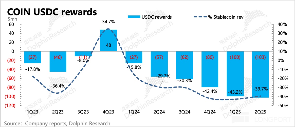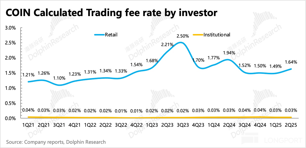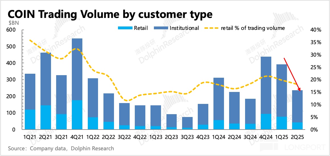 但 Coinbase 的零售端下滑幅度更大,相比一季度直接少了 45% 的量,比昨天发业绩的 Robinhood 还要差,公司提及当期主动调整稳定币交易对定价,带来了额外影响。海豚君认为,该定价策略的调整,本质上就是为了扩大平台内 USDC 优势。但 USDT 毕竟是当下渗透率最高的稳定币,因此交易量很难避免受影响。