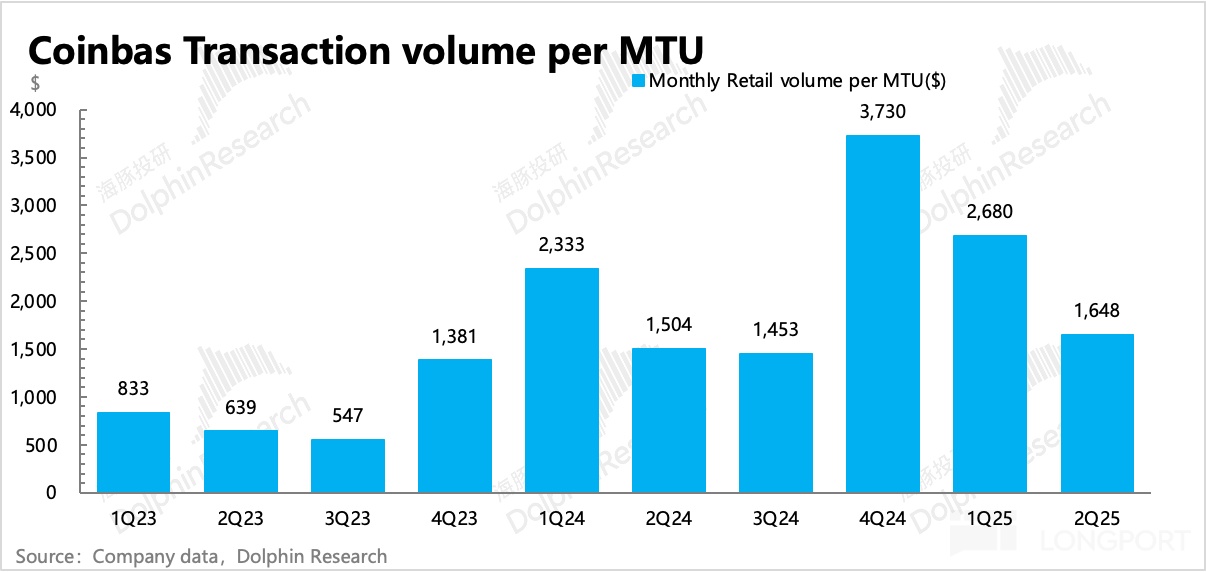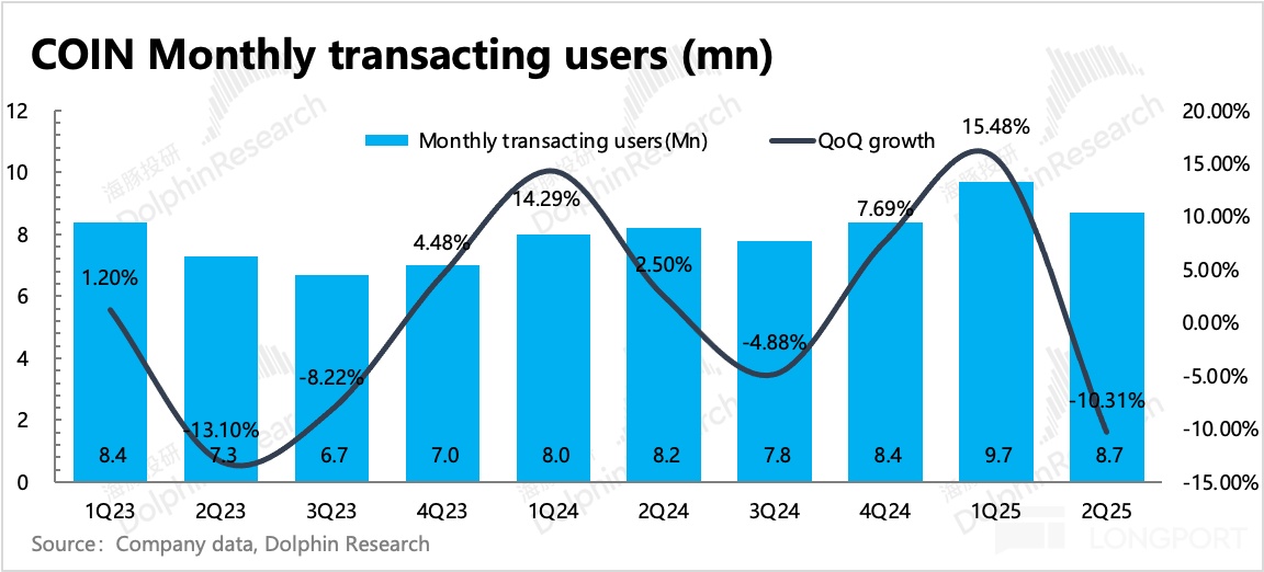 1. 交易降温已是共识: 尽管季末加密货币总市值新高,但二季度因为关税动荡,整体还是走了一个大大的过山车。短期恐慌式急跌时必然会影响当下的交易情绪,因此从整体行业来看,二季度交易量遇冷是普遍的。Coinbase 的月均交易用户数环比下滑了 10%。