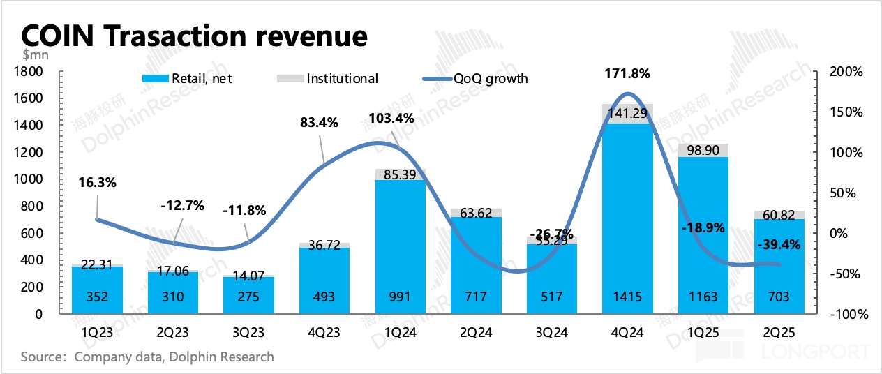 Coinbase 的短期基本面,还非常依赖交易收入。因此交易情绪一波动,对短期业绩的影响就非常大。