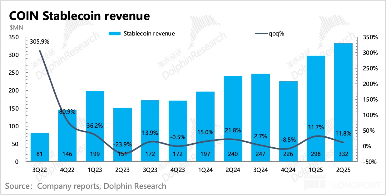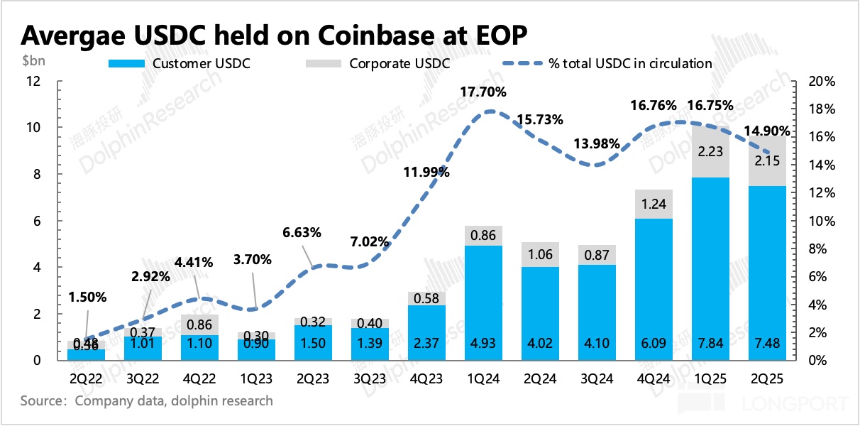 但实际在二季度期间的平均持有量为 138 亿,环比 Q1 的 123 亿净增了 15 亿。最终,稳定币收入环比增长 12%。(下图 USDC 规模为季末时点值)