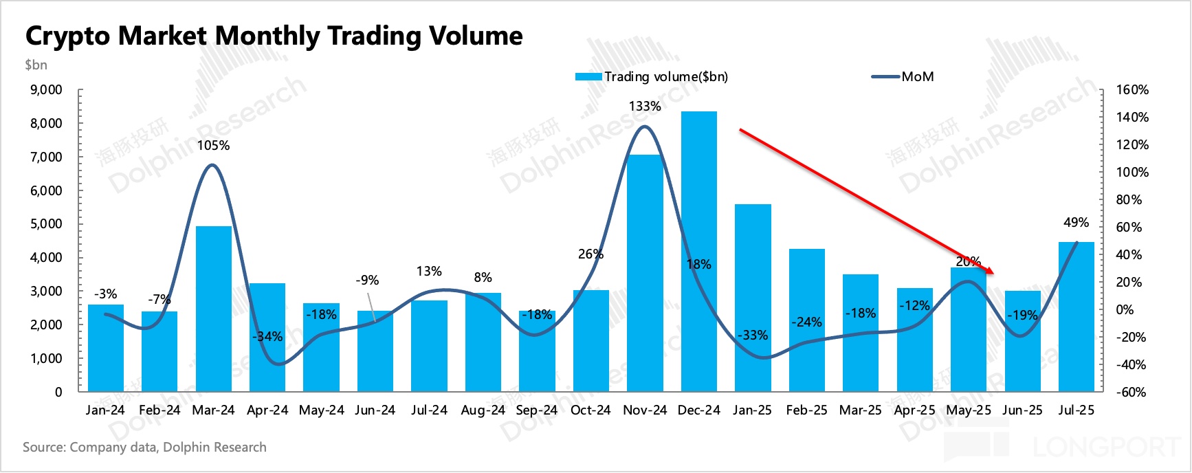 二季度,加密货币市值新高,但因期间关税波动,交易量却环比大幅萎缩。行业整体下降近 30%,其中散户交易波动会更明显。