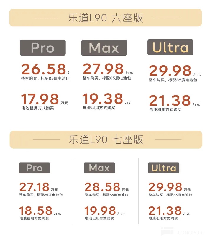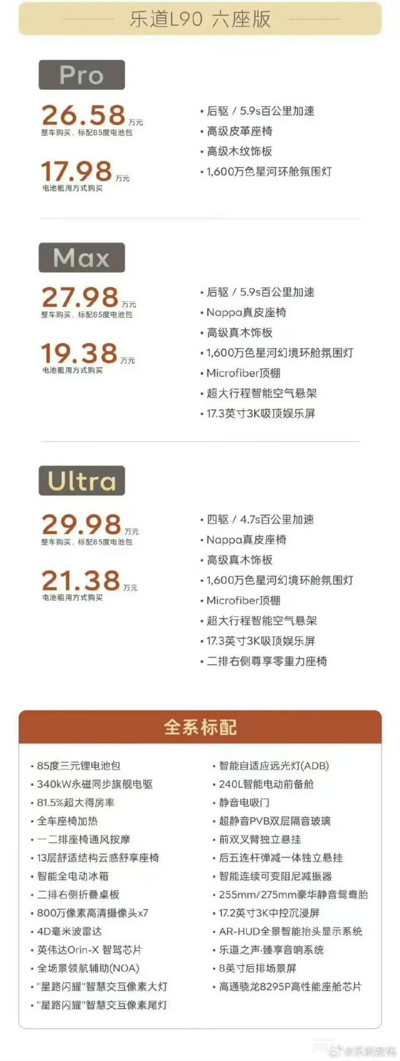 乐道 L90 三排六座版本:Pro/Max/Ultra 26.58/27.98/29.98 万元,BAAS 模式下车价下调了 8.6 万元至 17.98/19.38/21.38 万元;