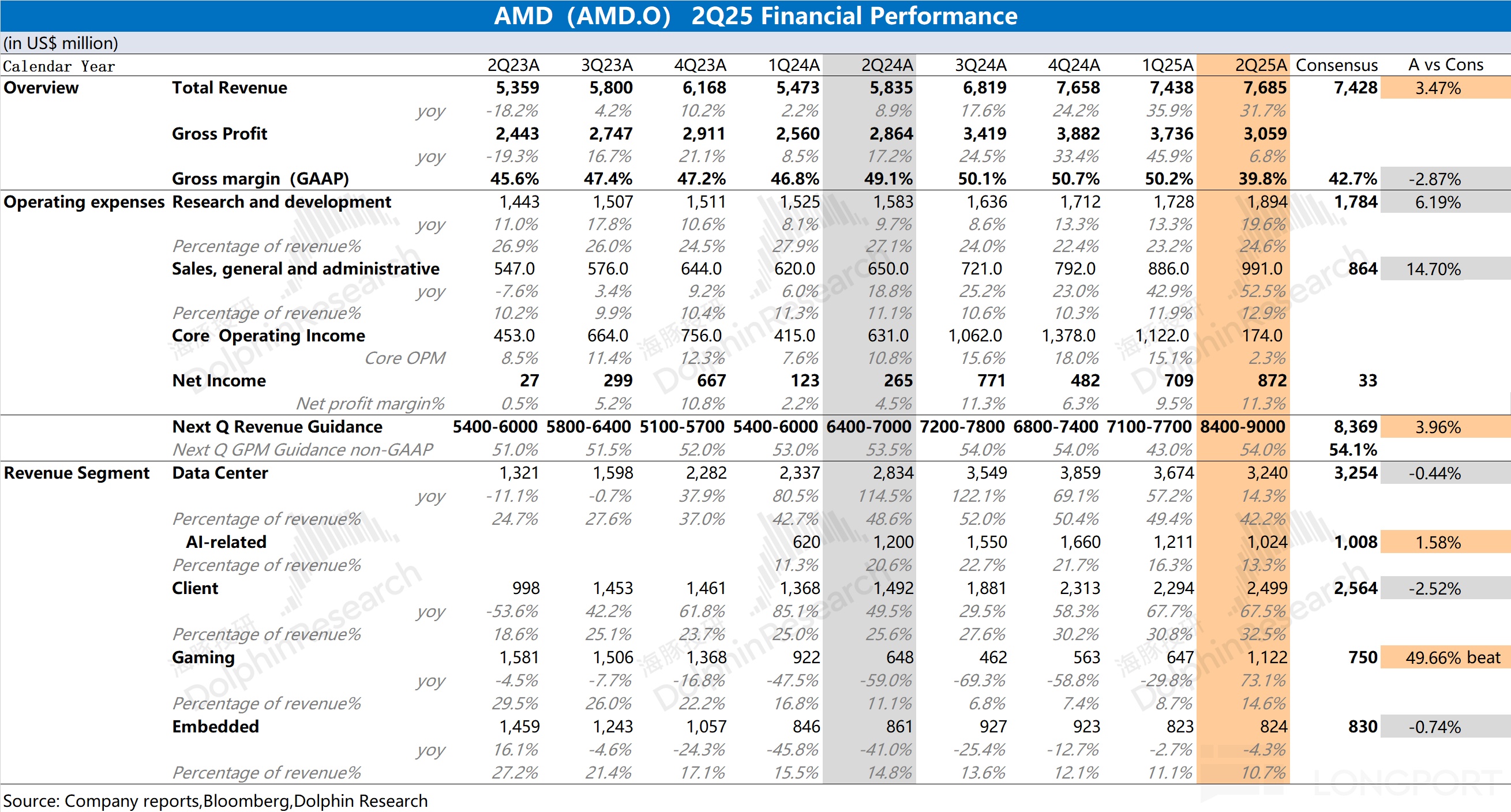 以下为海豚投研整理的 AMD 2025 年第二季度的财报电话会纪要,财报解读请移步《AMD:CPU 强吃英特尔,AI GPU 何时能抗英伟达?》