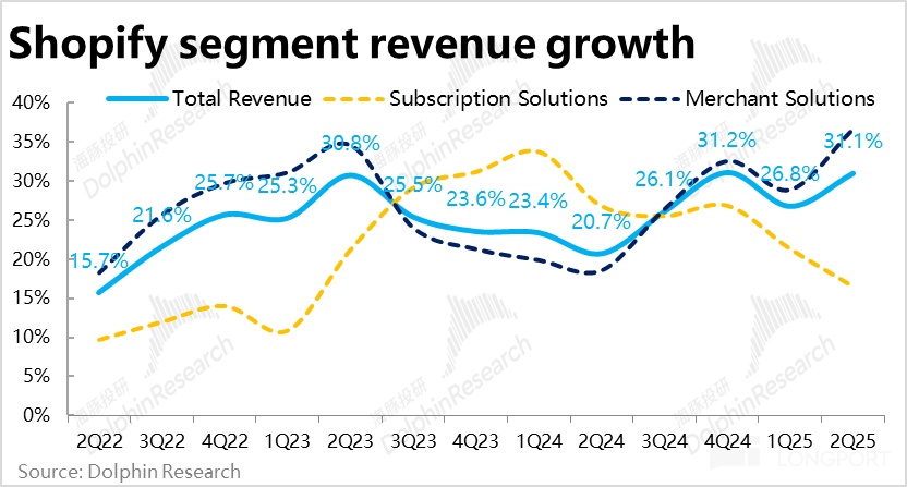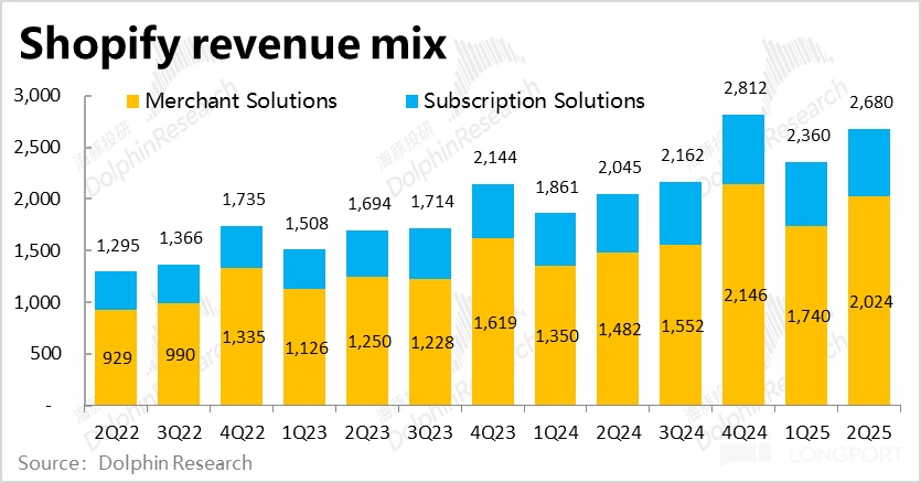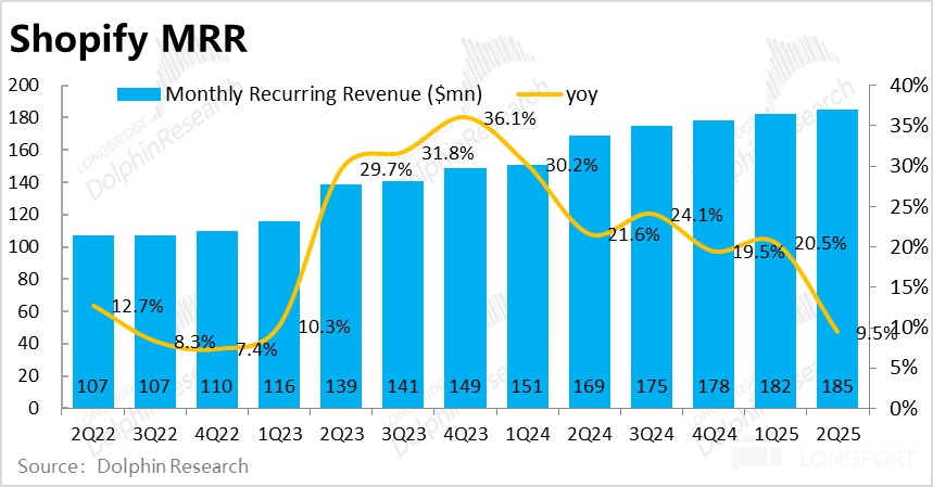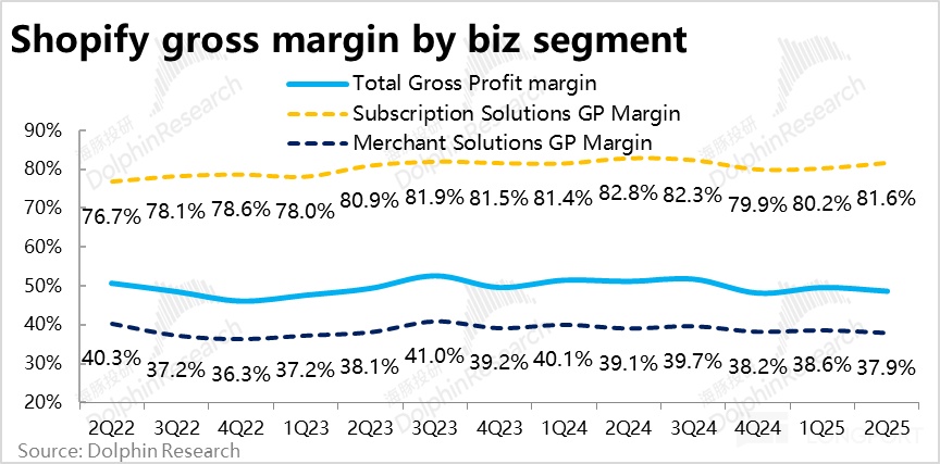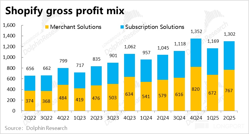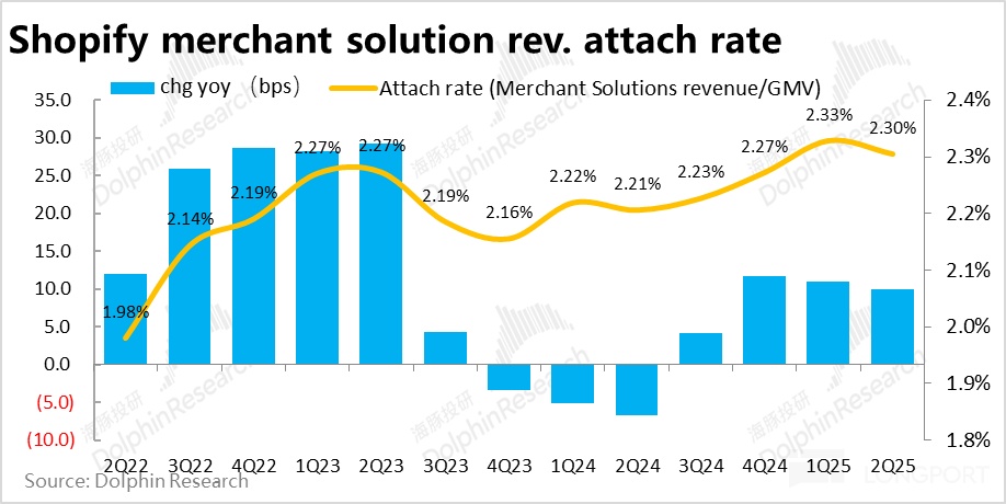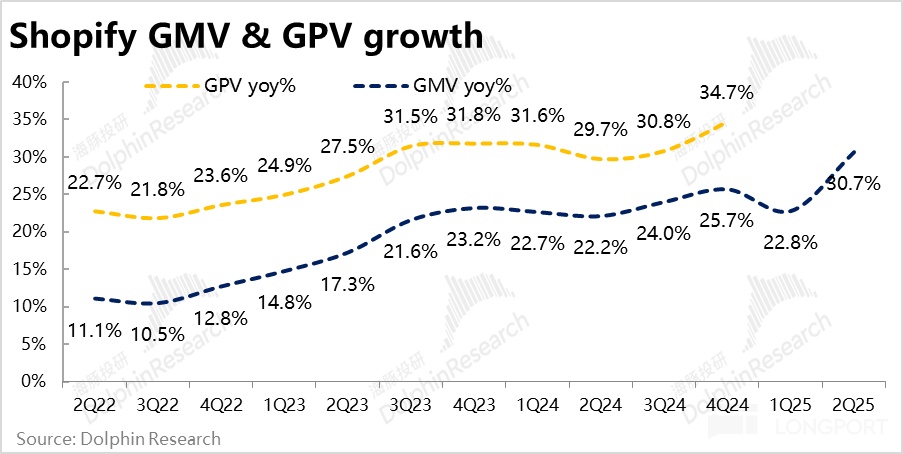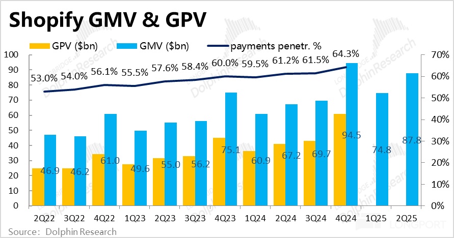 本季 Shopify 生态内 GMV 达 87.8 亿,同比大增 30.7%,明显加速且大超预期。根据电话会中的披露,支付额 GPV 占 GMV 的比重大约为 64%,和 4Q24 时大体相同,没有明显提升。换言之,GPV 基本是跟随 GMV 一通增长。