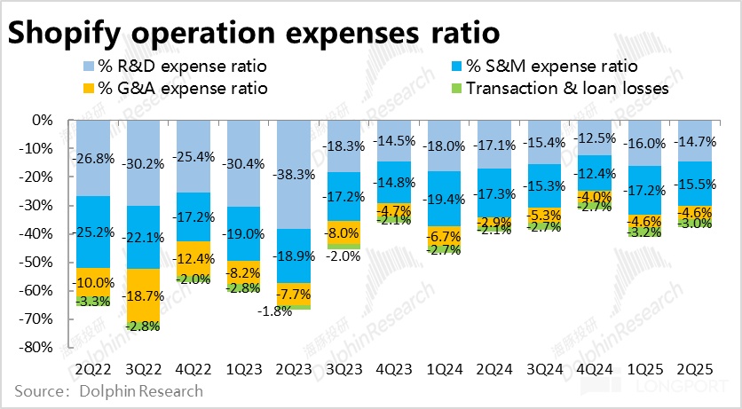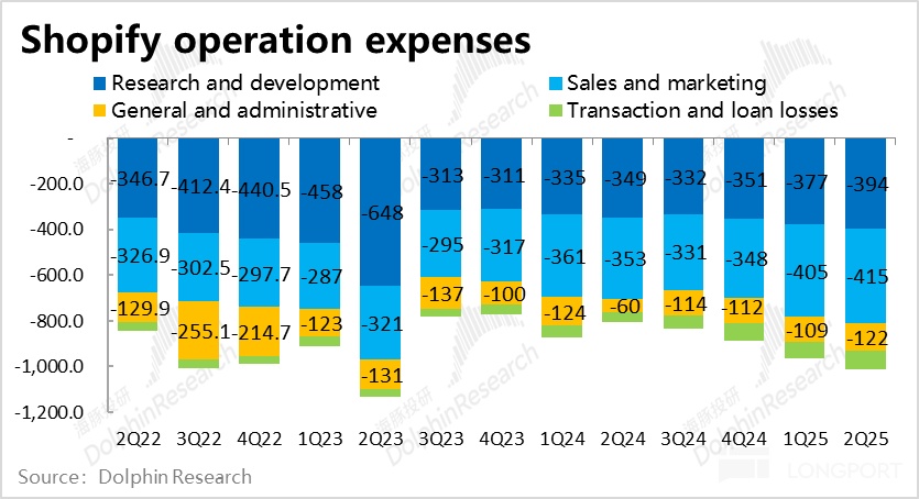 5、费用预期内明显增长:费用上,本季经营费用整体支出约$11.1 亿,和市场预期大体一致。不过趋势上,相比过去数个季度费用支出要么下滑要么仅小幅增加,本季度费用同比大增 近 26%,暗示着 Shopify 可以要重入投入扩张周期。