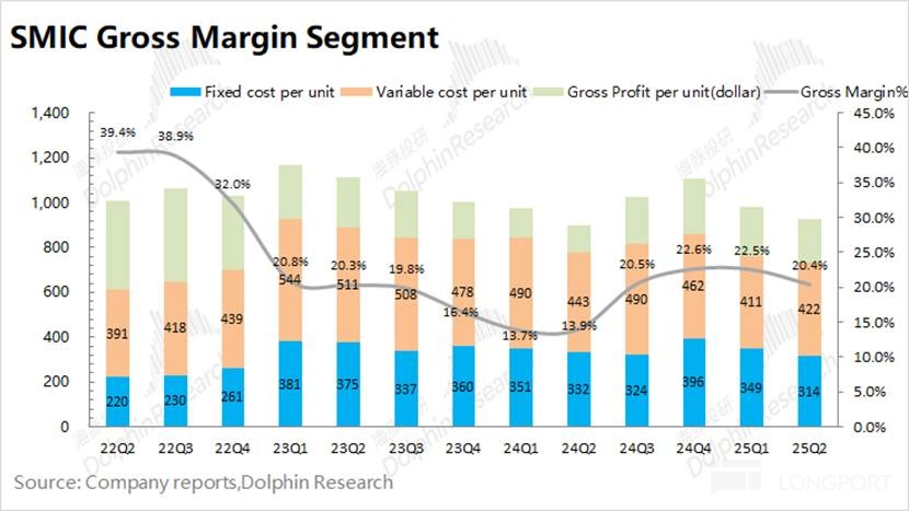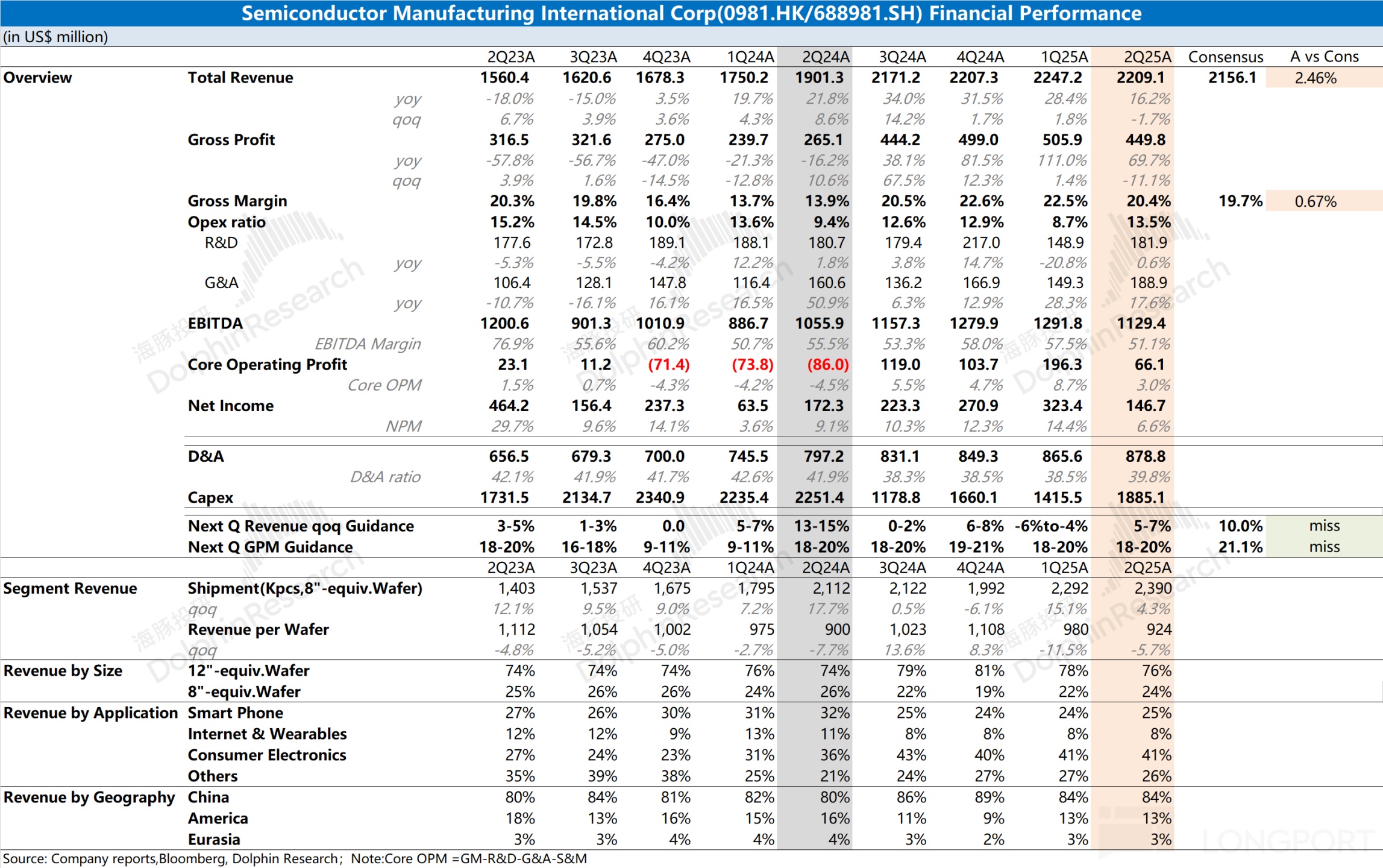 2025 年第二季度中芯国际的毛利率为 20.4%,环比下滑 2.1pct,市场一致预期(19.7%),达到指引区间上限(18-20%)。