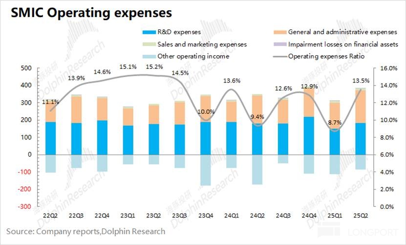 从经营开支角度看,本季度中芯国际经营开支是 2.99 亿美元,有所增加,主要是公司本季度的管理费用增加导致。本季度经营开支占比提升至 13.5%。