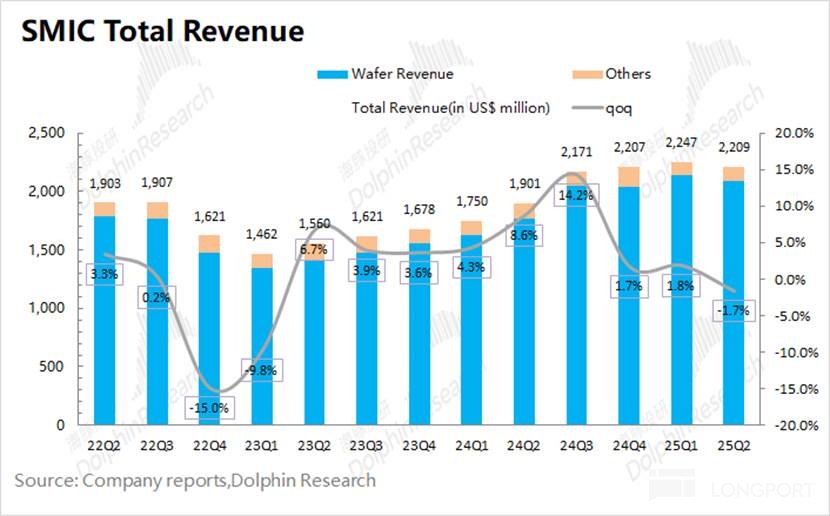 2025 年第二季度中芯国际实现营收 22.1 亿美元,环比下滑 1.7%,指引区间(环比下滑 4-6%)。主要是受到产线年度维修突发问题及设备改进的问题,以及 PC、智能家居及消费电子类下游市场需求回落的影响。