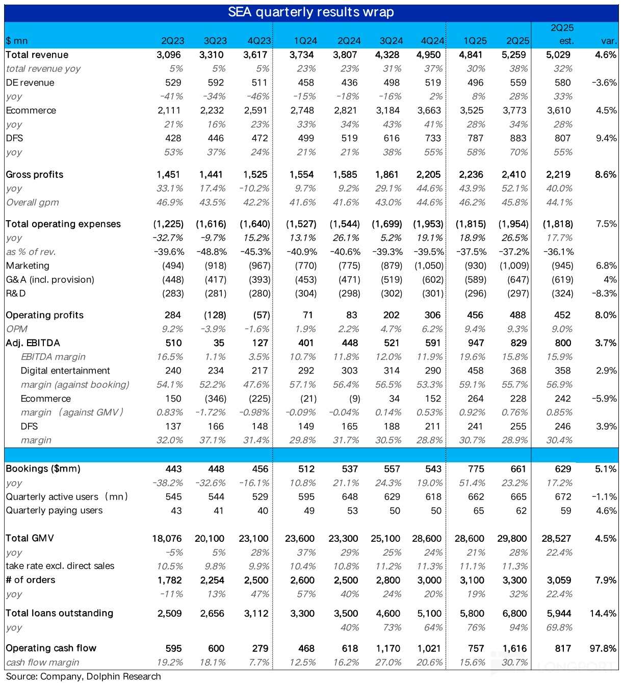 5、增长强劲但利润承压:汇总上述三大板块,电商和金融强劲增长,游戏业务也比保守预期的要好,本季 Sea整体收入同比增长 38% 到约$52.6 亿,同样是环比明显提速,且跑赢市场预期约 4.6%。