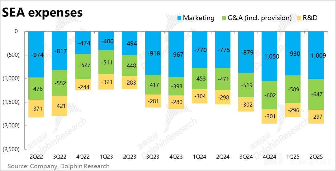 和环比下降的电商毛利率呈现的趋势类似,一方面电商业务在加大物流能力投入,优化履约时效和体验;另一方面,Monee 在破圈发展外部客户的情况下,获客等成本也势必提高。本季度四项经营费用合计支出近$19.5 亿,同比增长显著拉高至 26.5%,也明显高于市场预期费用增长的 18%。