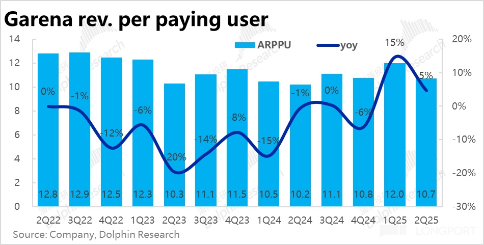 玩家情绪有所透支后,本季月活用户环比增长近乎停滞,付费用户反流失了 300w 人,付费率扭头下降。单用户平均付费金额的同比增幅也环比从 15% 下降到了 5%。
