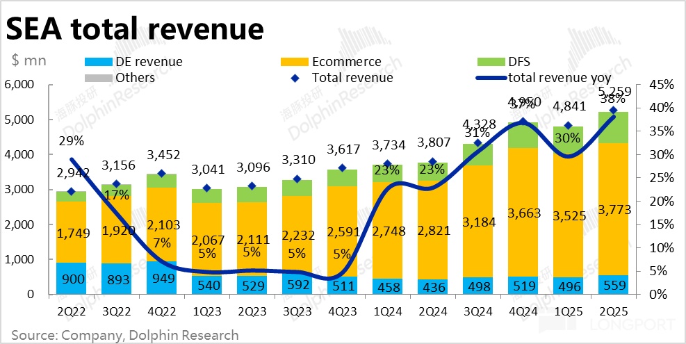 由于两大核心板块电商和金融业务本季营收都大幅跑超预期,本季 Sea 整体收入同比增速 38% 到约$52.6 亿,比预期多出约 4.6%。