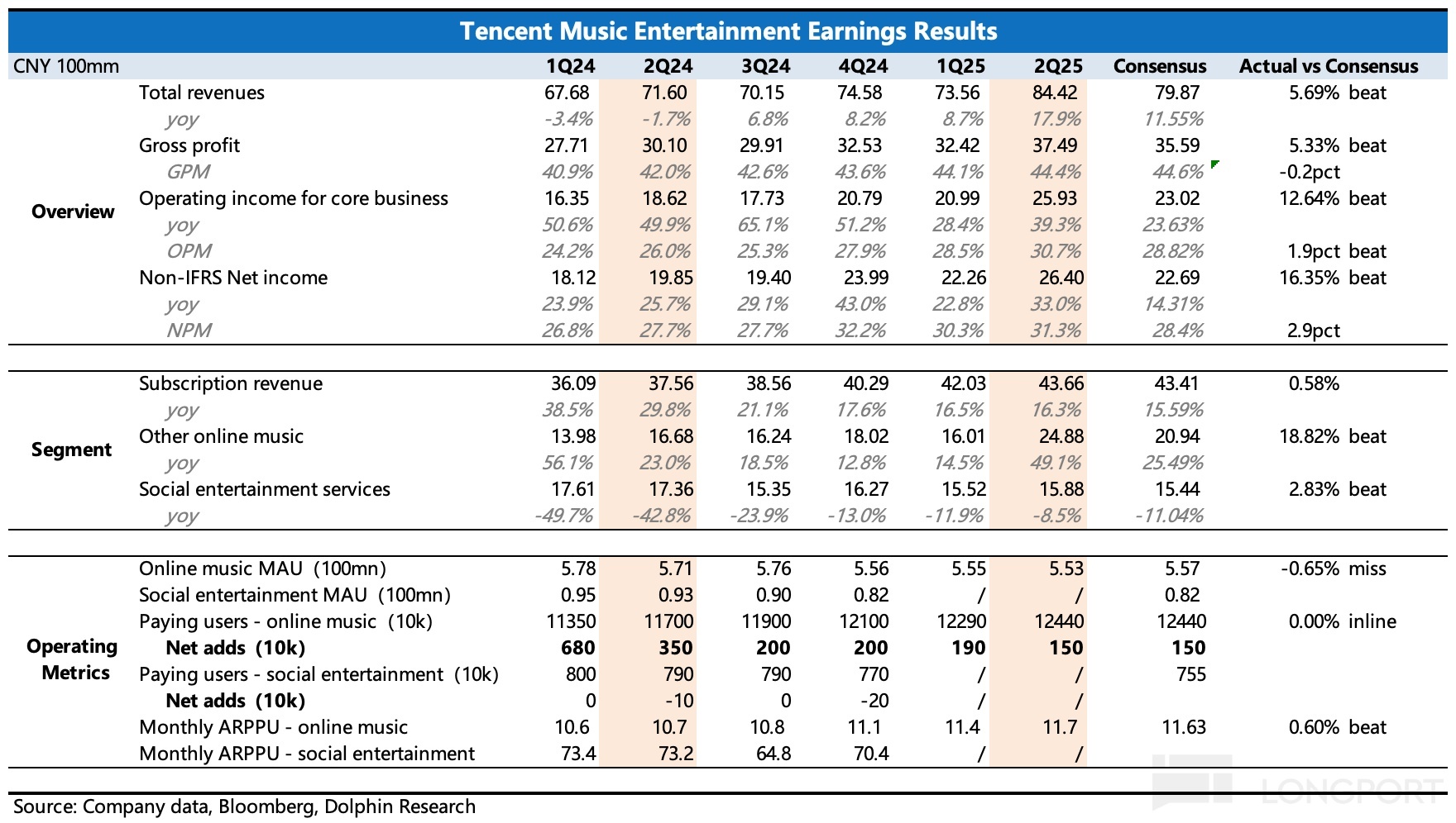 公司在 2025 年第二季度实现了高质量增长,收入和盈利能力均实现强劲同比增长,并预计强劲势头将延续到第三季度。在线音乐订阅业务仍是核心增长动力,并持续获得关注。
