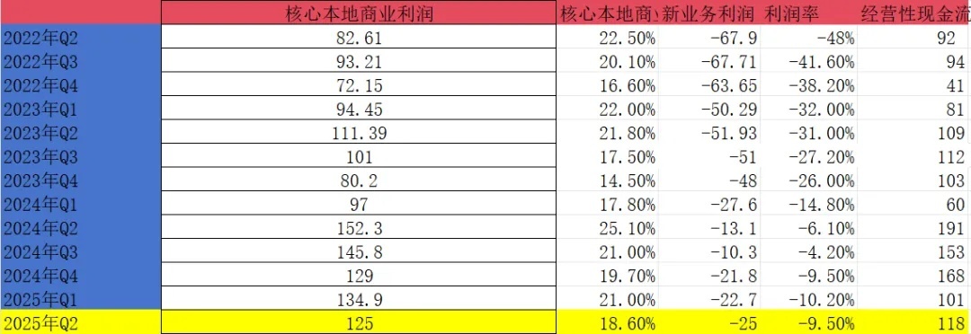 预计本季度核心本地商业经营利润约 125 亿,经营利润率大约 18.6%,同比下滑约 17.9%;新业务经营亏损约 25 亿,经营利润率约-9.5%,经营性现金流预计 118 亿。