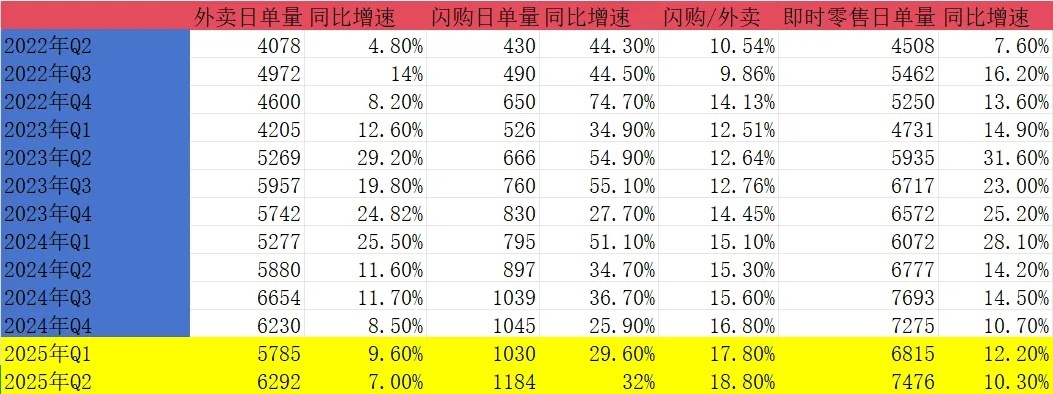 从 2025 年 Q1 开始,美团不再公布即时零售季度总单量,也不再披露具体的外卖、闪购单量信息,所以都是预估值(标黄处理)。