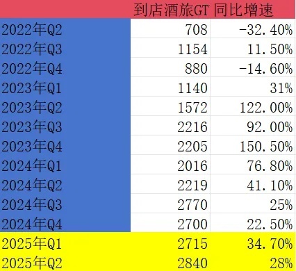 本季度到店酒旅 GTV 预计 2840 亿,同比增长 28%,到店增速更快,酒旅增速较慢,下沉市场增速极快,特价团、直播等折扣品增速超预期,因此客单价有下滑,单量增速快于 GTV 增速,佣金增速仍显著高于广告增速,收入增速远低于 GTV 增速、单量增速。