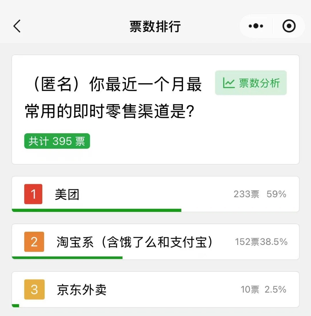 前几天我在读者中做了一份抽样调查,淘宝(含饿了么/支付宝渠道)的常用份额确实有较为明显的增长,但美团仍然处于优势地位。