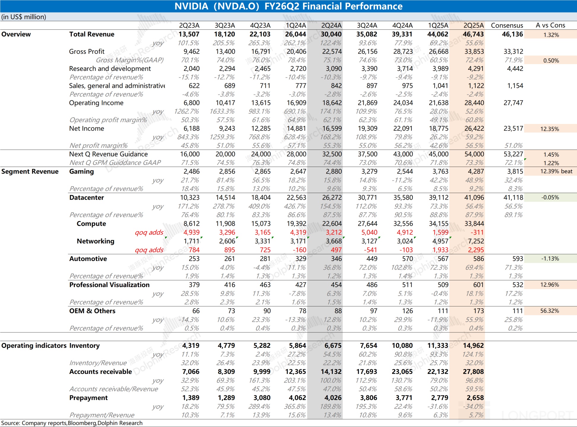 c. 毛利率: GAAP 毛利率为 72.4%,非 GAAP 毛利率为 72.7%。若排除 H20 库存释放带来的收益,非 GAAP 毛利率为 72.3%,仍高于预期。