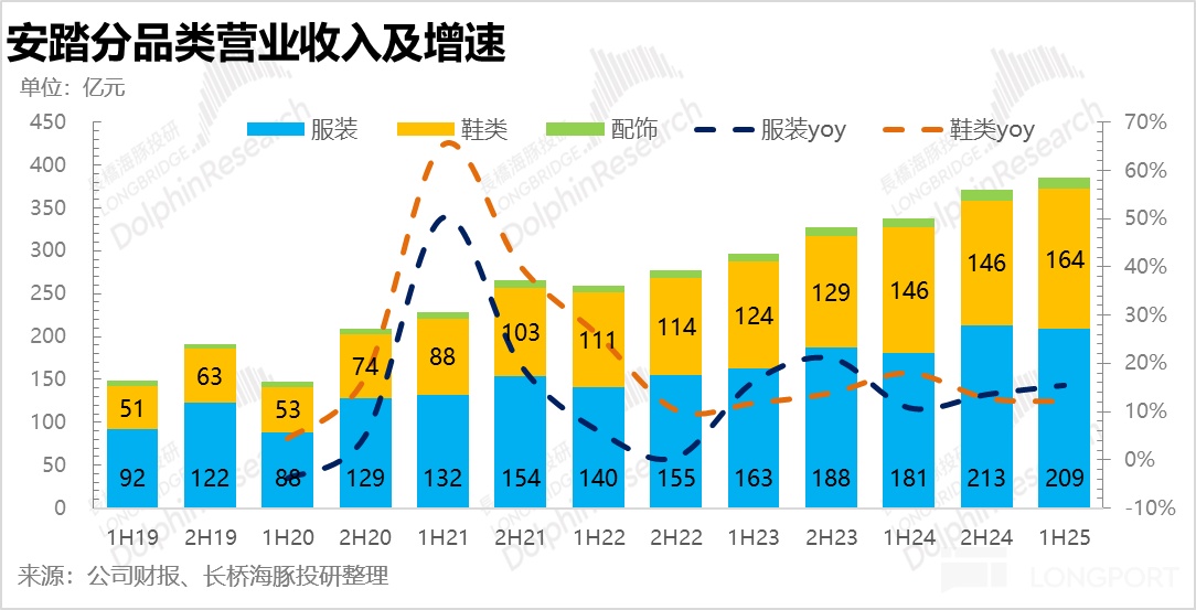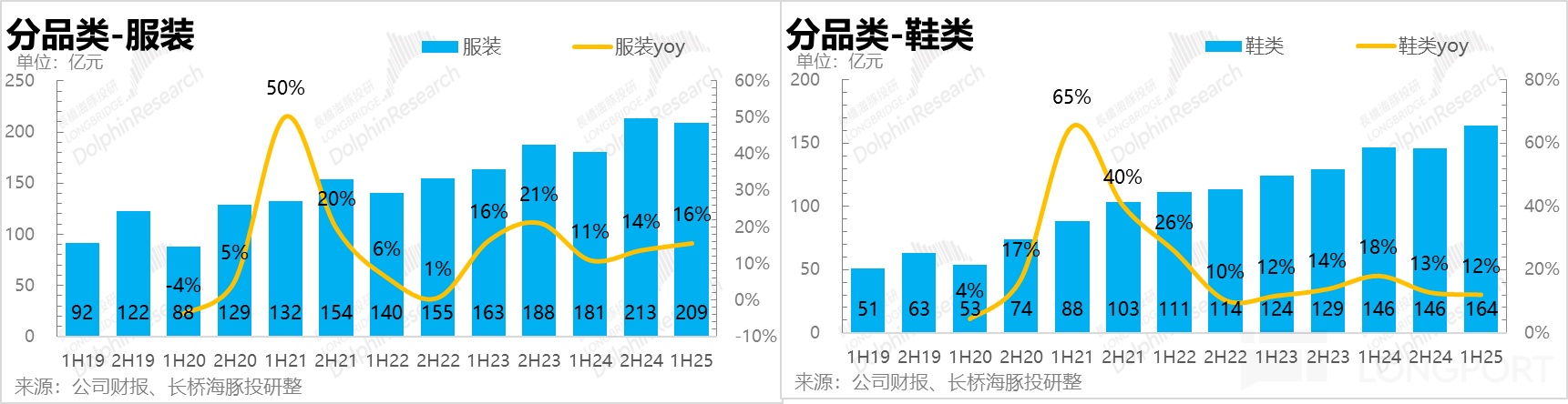 从品类上看,鞋类实现营收 163.9 亿元,同比增长 12%,其中跑鞋品类销量高增,PG7 跑鞋销量超 200 万双,超出市场预期,篮球鞋、休闲鞋表现平平。