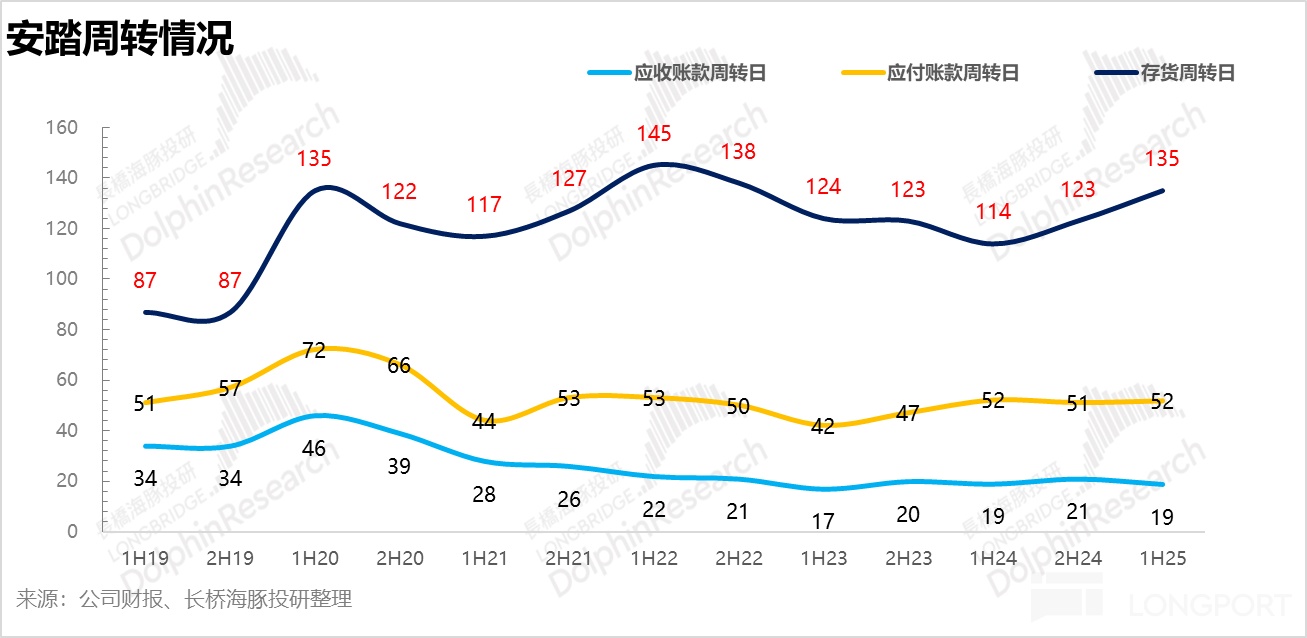 整体来说,安踏最大的问题还是出现在主品牌和 FILA 的基本盘的去库存上。截至上半年末,公司的库存周转天数已经提升到 135 天,接近历史最高水平。