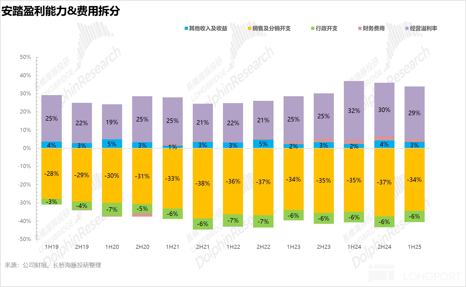从毛利率上看,由于安踏和 FILIA 均加大了线上渠道的销售占比(折扣力度更大),因此带动整体毛利率小幅下滑 0.7pct 达到 63.4%,