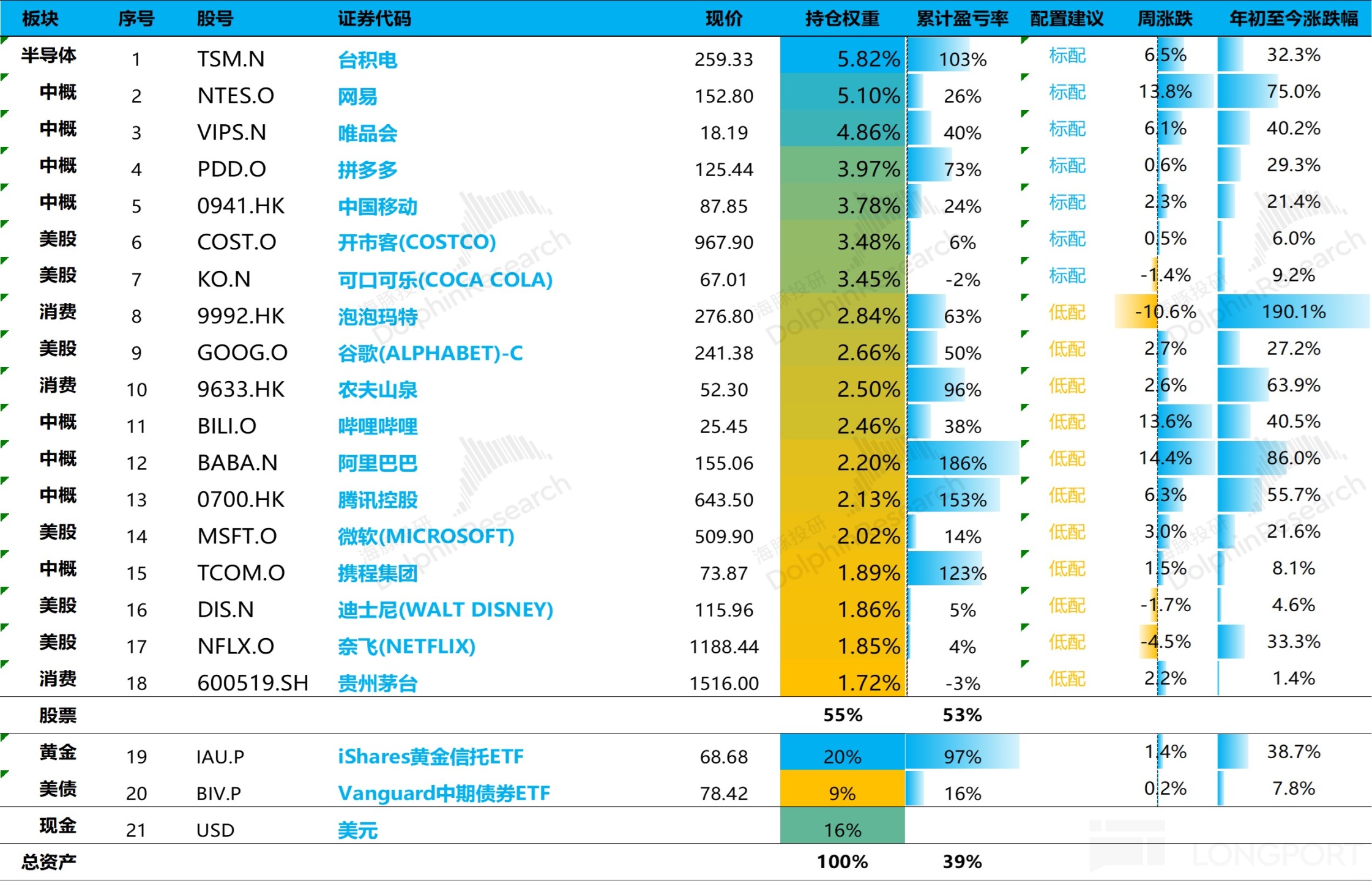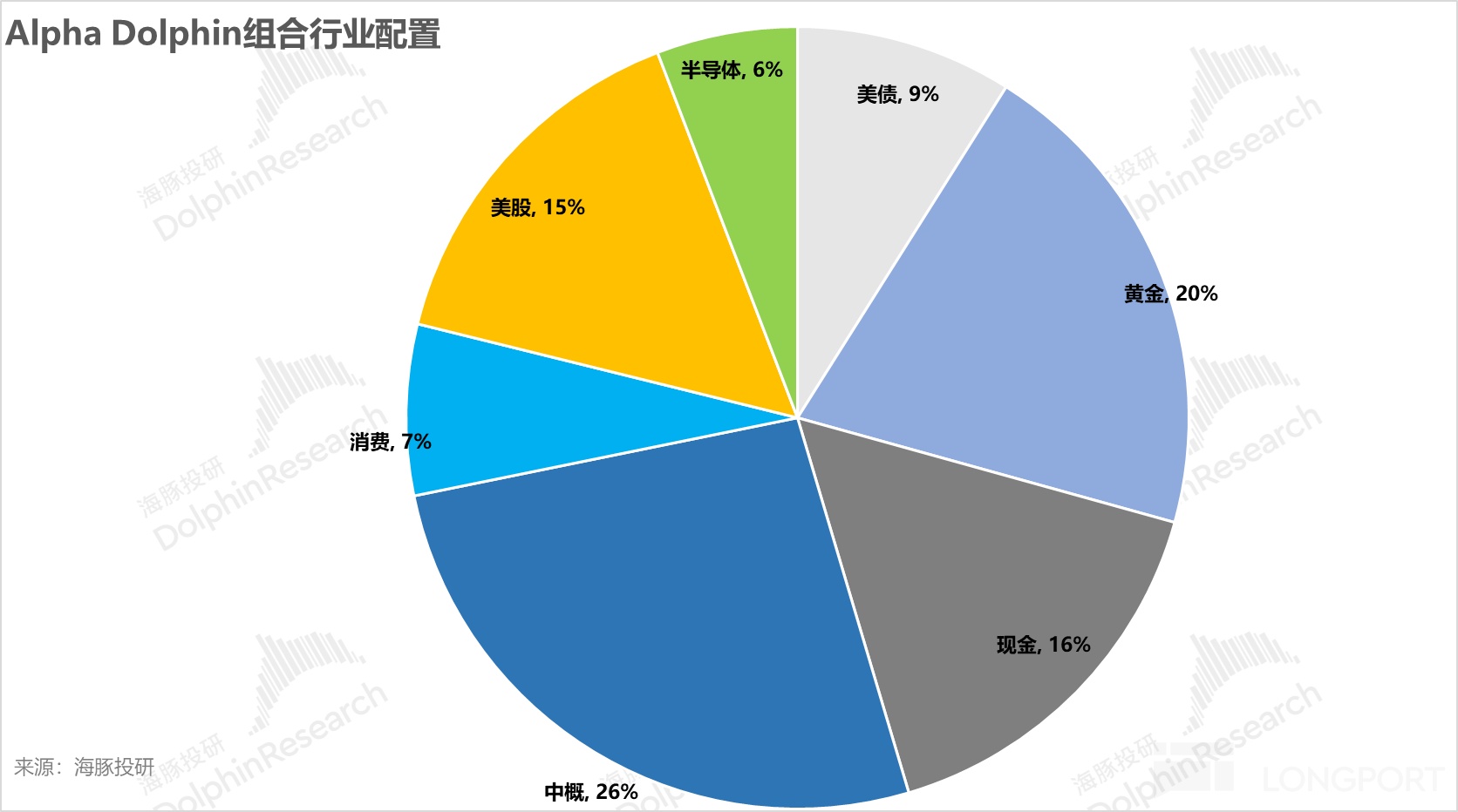Alpha Dolphin 虚拟组合共计持仓 18 只个股与权益型 ETF,其中标配 7 只,其余低配。股权之外资产主要分布在了黄金、美债和美元现金上,目前权益资产与黄金/美债/现金等防守资产之间大约 55:45。