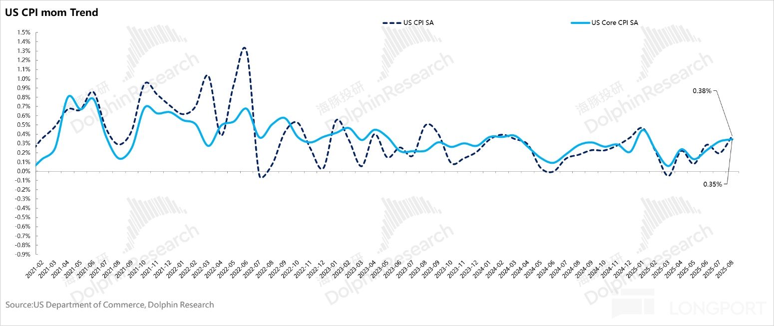 而除了就业,上周公布的 8 月核心 CPI,是观察关税有没有向实体经济渗透的一个关键指标,结果是环比增长了 0.35%(如果接下来每个月都是这个增长,那么一年后的 CPI 同比就会是 4.3%),确实还是在比较高的状态。