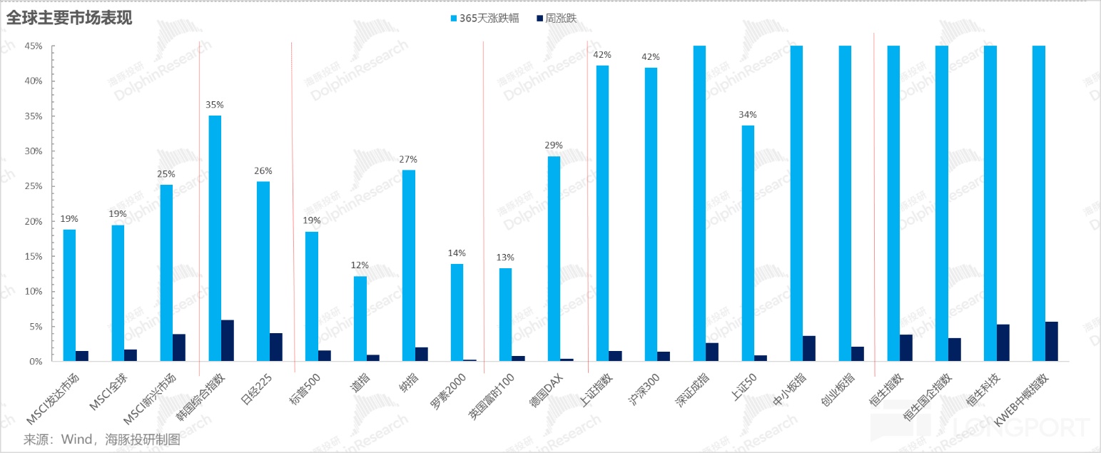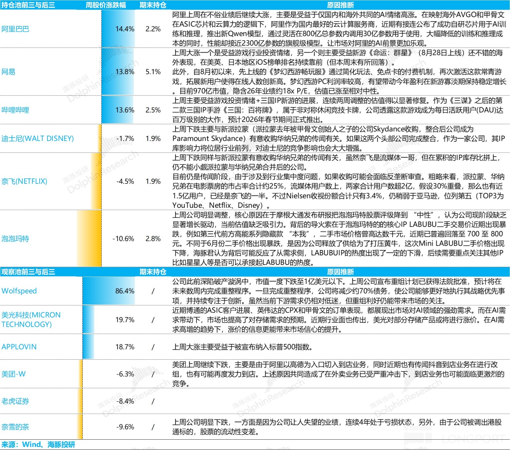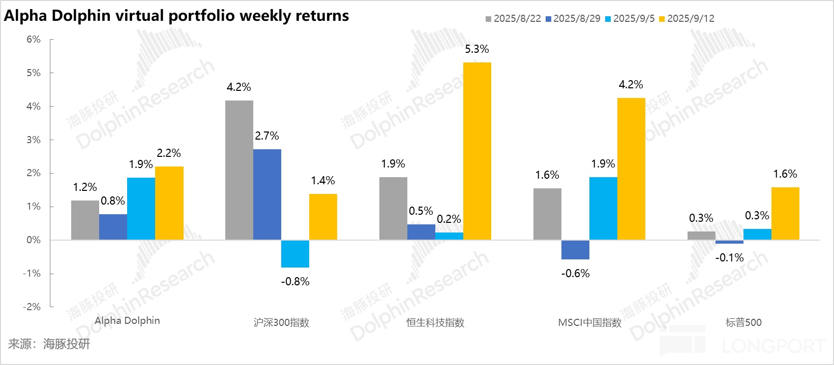 上周海豚君的虚拟组合 Alpha Dolphin 的收益主要来源于网易、阿里巴巴、B 站等中概资产在美联储降息的大背景下跑出超额收益,但由于配置中有较高的黄金和债券等,导致收益相比高弹性指数如恒生科技等稍低。