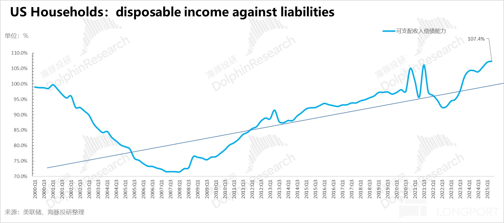 2)居民的财富效应仍在:二季度居民因为美股调整后进一步勇攀高峰,股权投资再次显著升值,家庭净资产快速回升,并创下新高;居民的可支配收入相对家庭负债的偿付能力创新高,居民杠杆率进一步下降,财富效应拉满,居民安全感进一步巩固。
