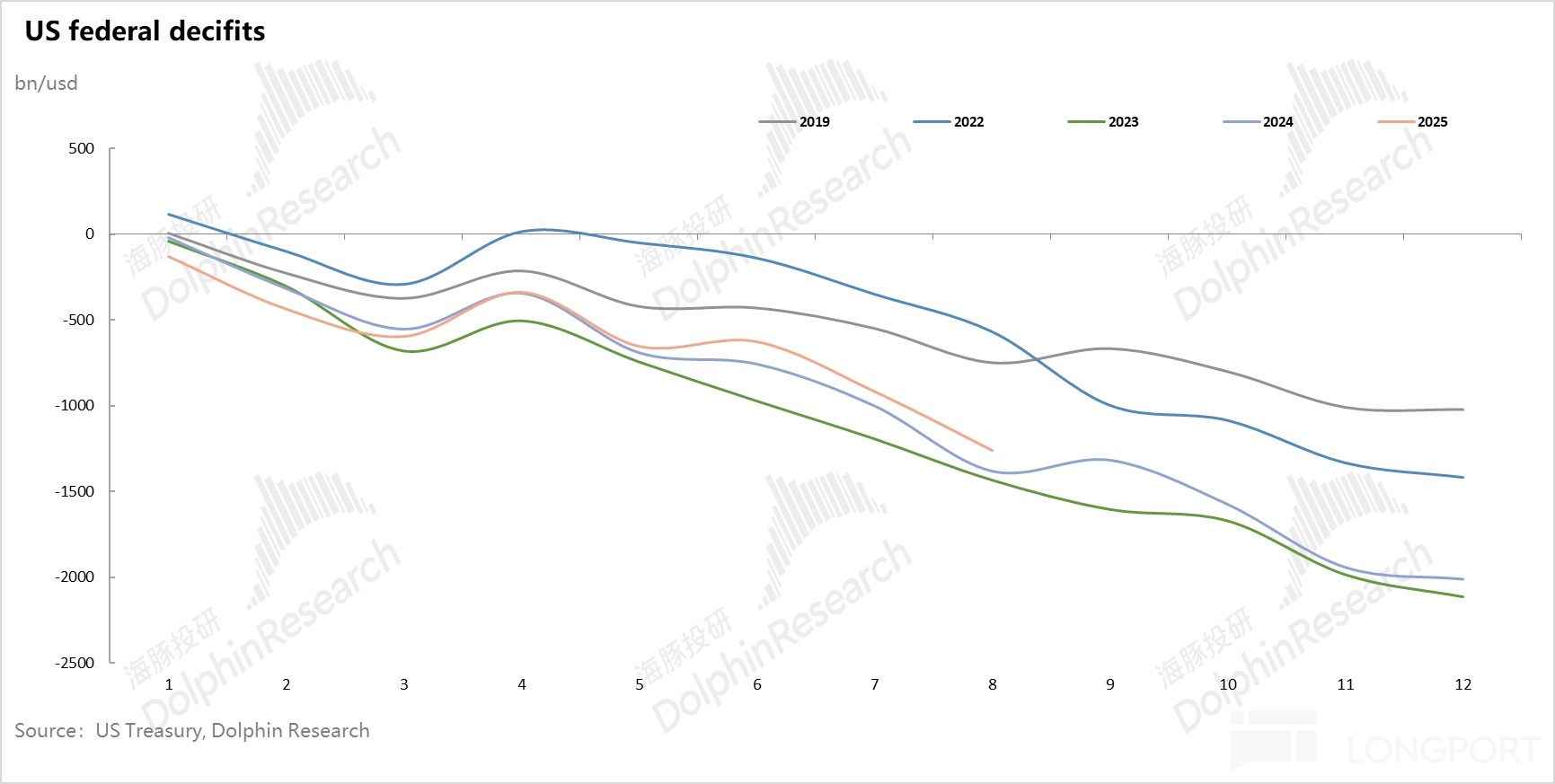 1)2025 年美国财政的刺激规模:截止到今年 8 月,美国联邦财政赤字相比 2024 年确实低了一些,二季度剔付息支出的赤字率 3.1%,也比去年同期的 3.6% 有所下降。但本身这个赤字水平相比疫情前的正常经济时期,还是在较高的水平上,财政对经济的扶持力度并没有明显减少。