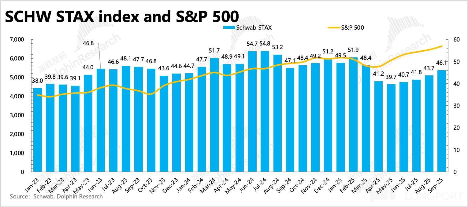不过交易频率环比二季度略有下降,与二季度行情表现更占优有关。二季度标普 500 上涨 7.6%,高于三季度的 6.5%。但值得一提的是,三季度衍生品交易笔数占比环比提高了 2 个点。