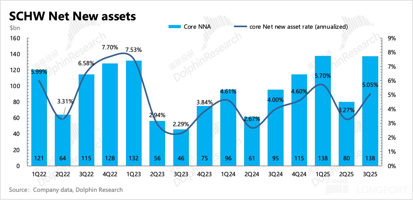 从最终的年化增速上来看,也就是“5% 的新增入金 +7% 的市场波动” 带来总资产规模 12% 的内生性增速。但市场波动不受控,因此新增入金的增速是内生增长的关键,也就是海豚君一直强调的净新增资产规模(NNA)。